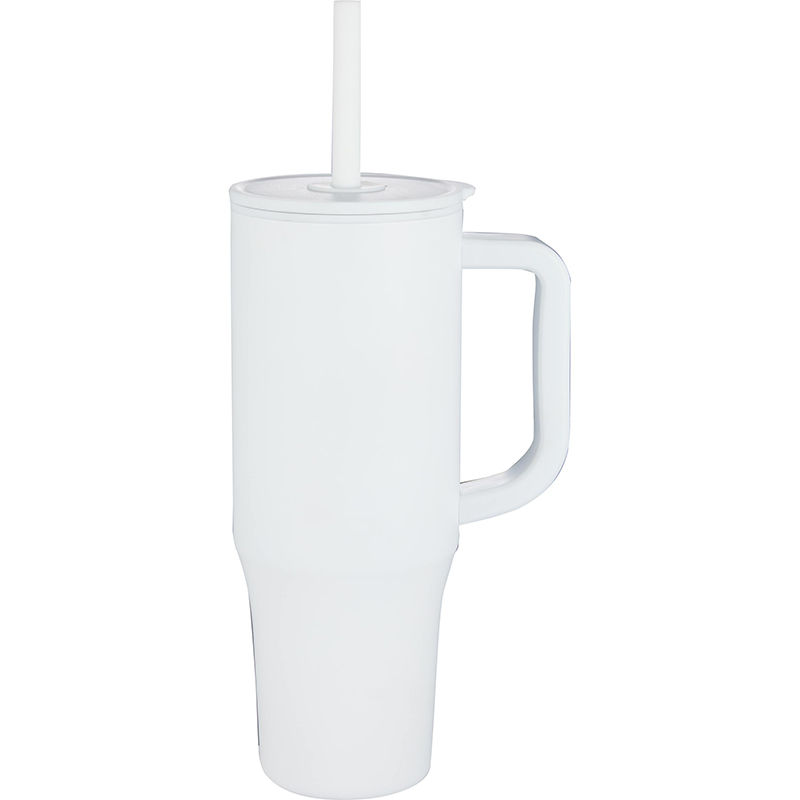 The integrated food-grade silicone straw is designed for easy reuse daily. The Erie has a 30oz capacity for fewer refills and features a slim base that fits into most cupholders, a comfortable carry handle, and a splash-proof press-on lid.