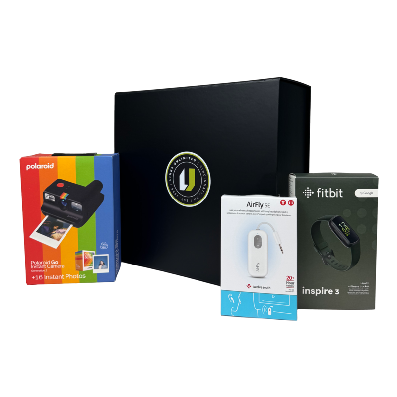 Inside, you'll find a Polaroid Go Camera to capture every moment, a Fitbit to do what you love most and feel your best, and an AirFly SE from Twelve South, the most affordable way to listen to in-flight movies with your wireless headphones or earbuds.