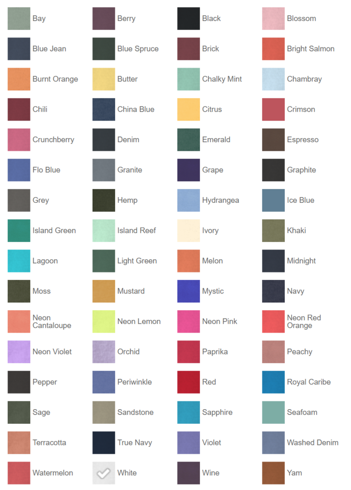 Product/Part Colors 1: White, Grey, Blue Jean, Seafoam, Chalky Mint, Black, Lagoon, Chambray, Crimson, Island Reef, Watermelon, Flo Blue, Pepper, True Navy, Granite, Violet, Ice Blue, Butter, Brick, Neon Red Orange, Denim, Royal Caribe, Berry, Bright Salmon, Midnight, Blue Spruce, Light Green, Crunchberry, Red, Blossom, Melon, Sandstone, Washed Denim, Neon Pink, Chili, Paprika, Sapphire, Yam, Graphite, Mustard, Hemp, Orchid, Navy, Citrus, Emerald, Ivory, China Blue, Moss, Bay, Burnt Orange, Khaki, Periwinkle, Terracotta, Sage, Neon Violet, Neon Lemon, Grape, Espresso, Hydrangea, Island Green, Wine, Mystic, Peachy, Neon Cantaloupe