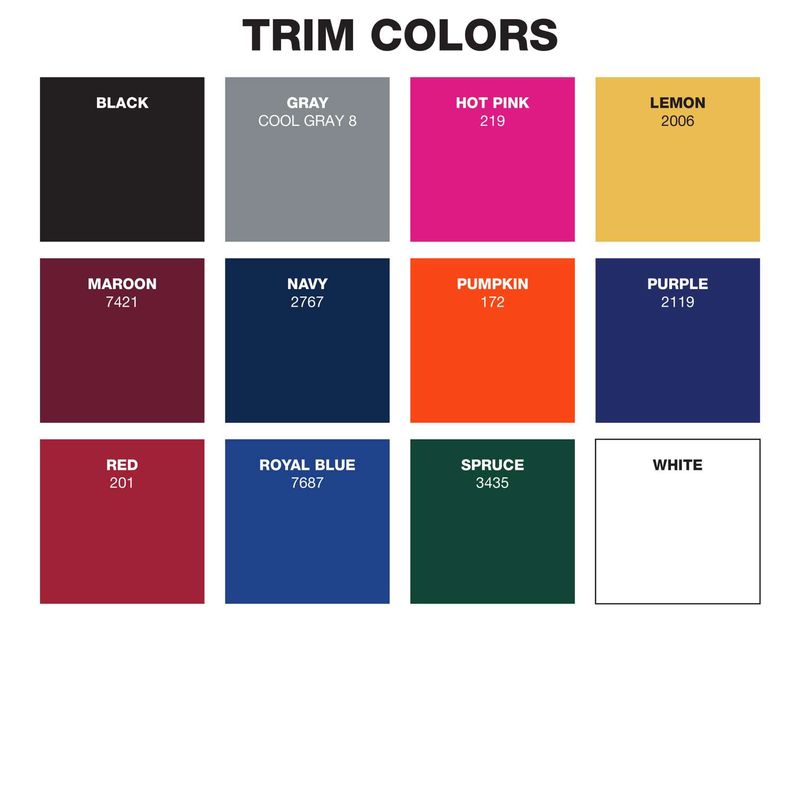 Product/Part Colors 4: Trim Colors:black, grape, gray, natural, navy, pumpkin, red, white, yellow