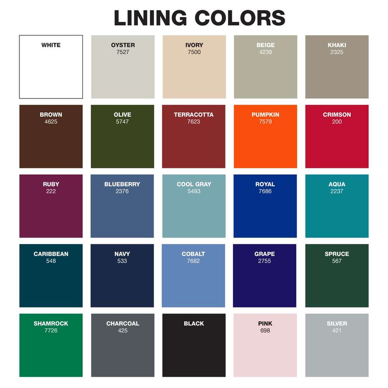 Product/Part Colors 5: Optional Lining Colors: white, oyster, ivory, beige, khaki, brown, olive, terra cotta, pumpkin, crimson, ruby, blueberry, cool grey, royal, aqua, caribbean, navy, cobalt, grape, spruce, shamrock, charcoal, black, pink, silver