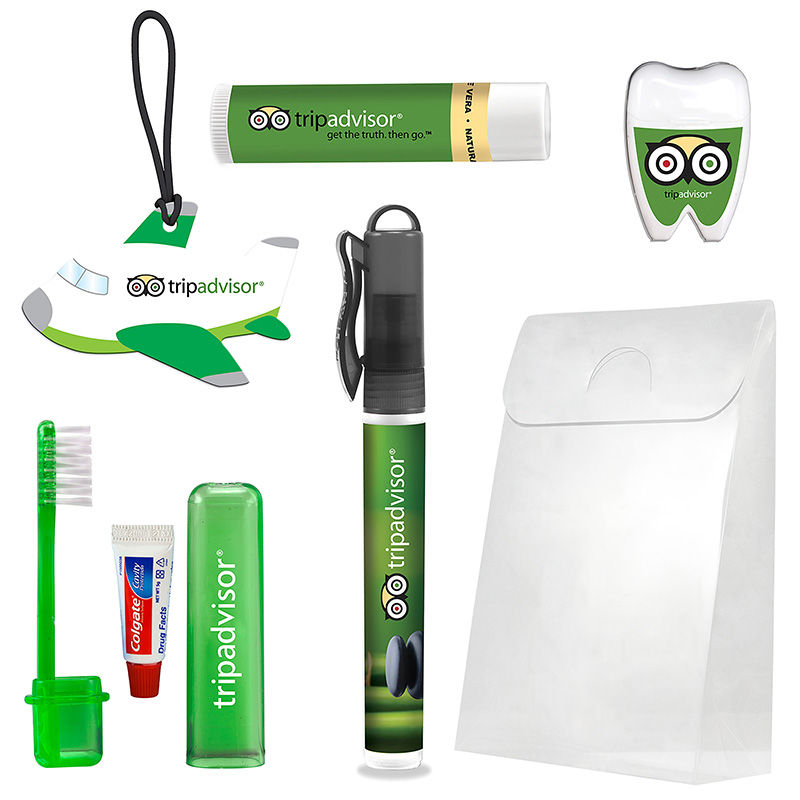 From classic travel items such as the luggage tag to amenities such as the dental floss mirror and spray sunscreen, your logo will be seen over and over.