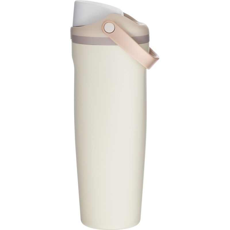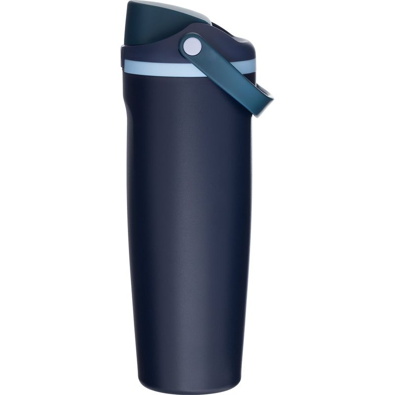 The dual-purpose threaded lid includes a push-button locking mechanism and a sip opening with built-in straw, allowing you to sip or swig your way.