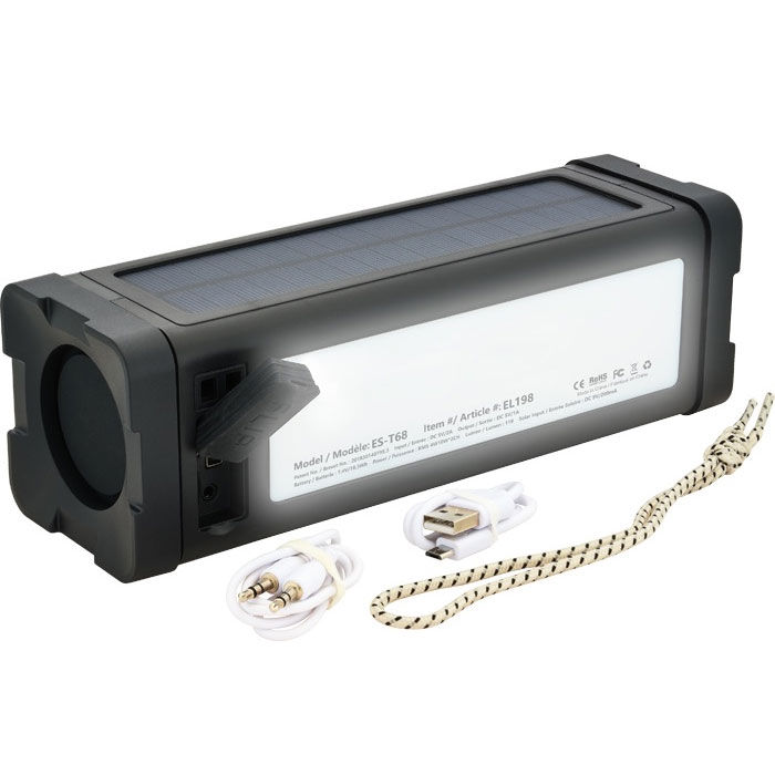• Rugged ABS plastic and fabric 20 watt Bluetooth® speaker (2 x 10 watt) with solar panel and 5,000 mAh capacity power bank