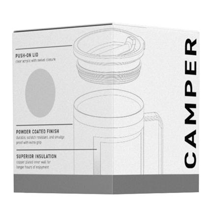 12 oz double wall 18/8 stainless steel thermal mug with copper vacuum insulation, stainless steel rim, clear push-on lid, swivel closure, and powder coated finish - gift box included.