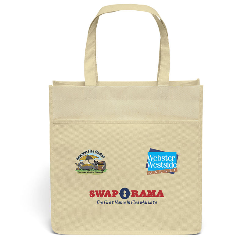 105 combined GSM matte laminated tote bag, with a large non-woven polypropylene pocket on the front for your imprint.