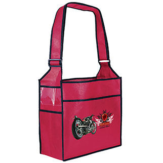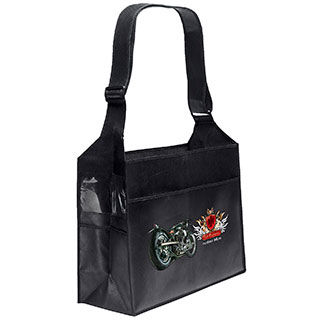 100 GSM premium non-woven polypropylene event tote with adjustable shoulder strap, gusset pockets, document pouch, and plastic bottom insert.
