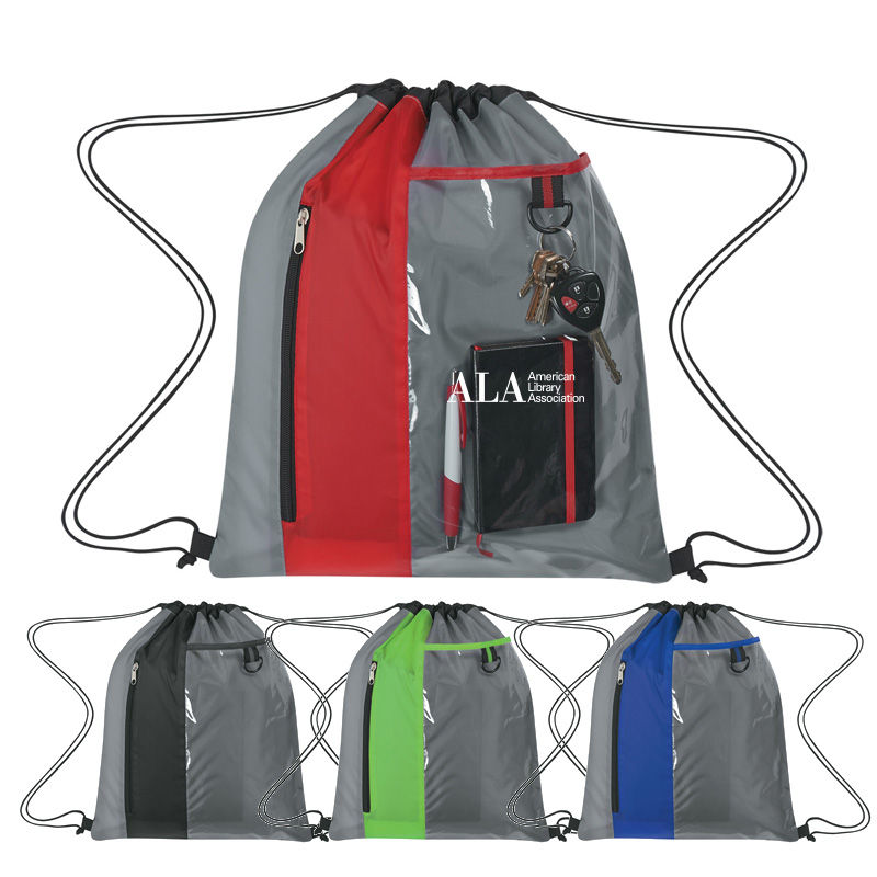14" x 17" Polyester Drawstring Cinch Backpack with Clear Pocket - Stadium Security Approved
