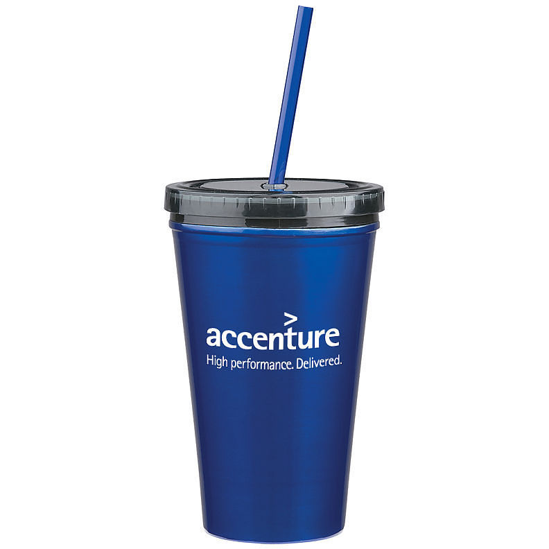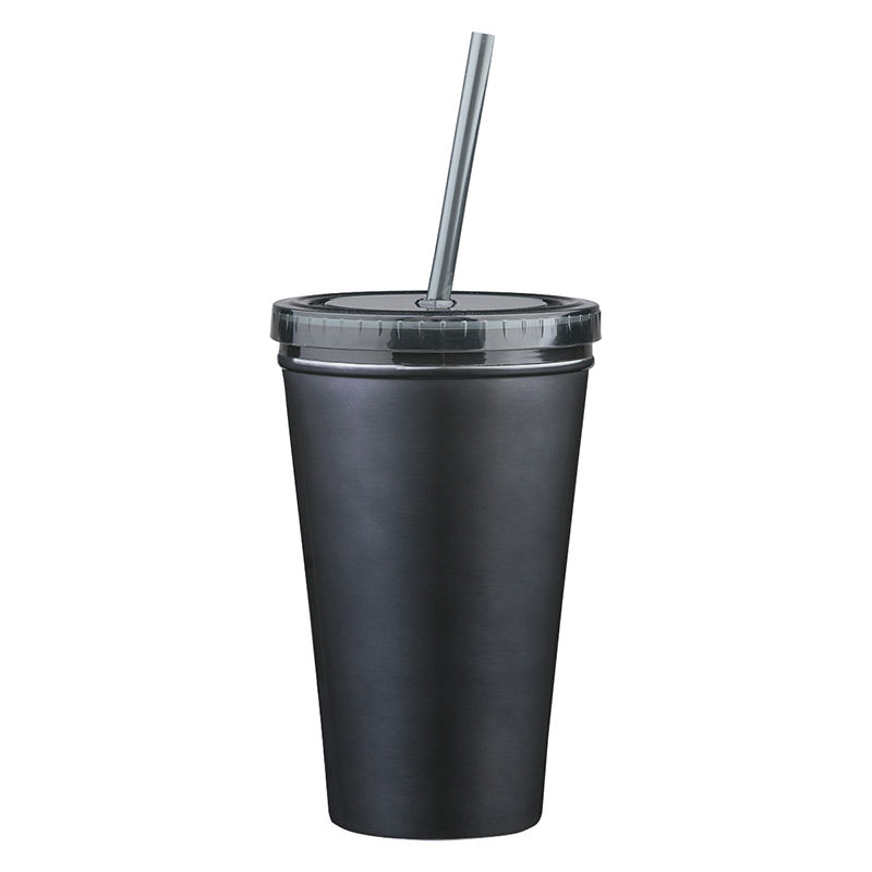 16 Oz. Reusable "Carry Out" Cup - Stainless Steel Double Wall Tumbler With Straw
