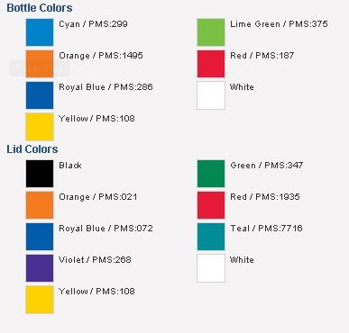Product/Part Colors 1: Bottle: cyan, orange, royal, yellow, lime, red, white