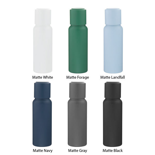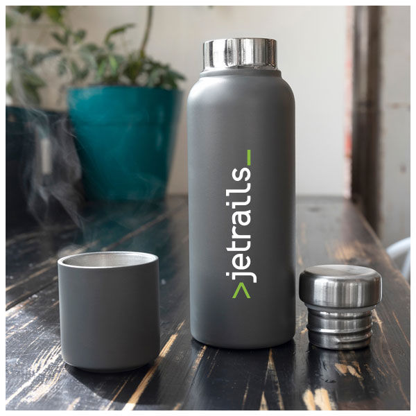 16.9 oz double wall 18/8 stainless steel thermal bottle with copper vacuum insulation, threaded insulated lid, magnetic cup/lid, and powder coated finish.