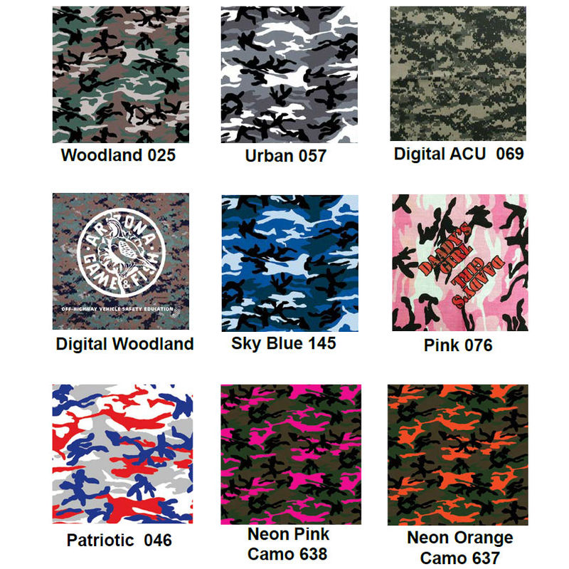 Product/Part Colors 1: Digital Desert 073, Digital Woodland 072, Sky Blue 145, Pink 076, Patriotic 046, Neon Pink Camo 638, Neon Orange Camo 637