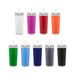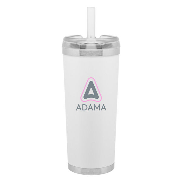 24 oz double wall 18/8 stainless steel thermal tumbler with copper vacuum insulation, stainless steel rim and base, snap fit Tritan threaded lid and flexible wide silicone straw