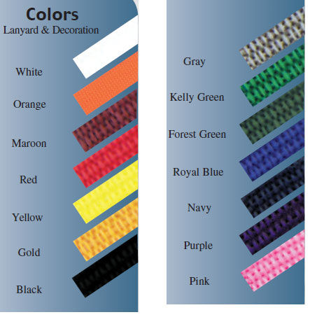Product/Part Colors 1: White, Orange, Maroon, Red, Yellow, Gold, Black, Gray, Kelly Green, Forest Green, Royal Blue, Navy, Purple, Pink