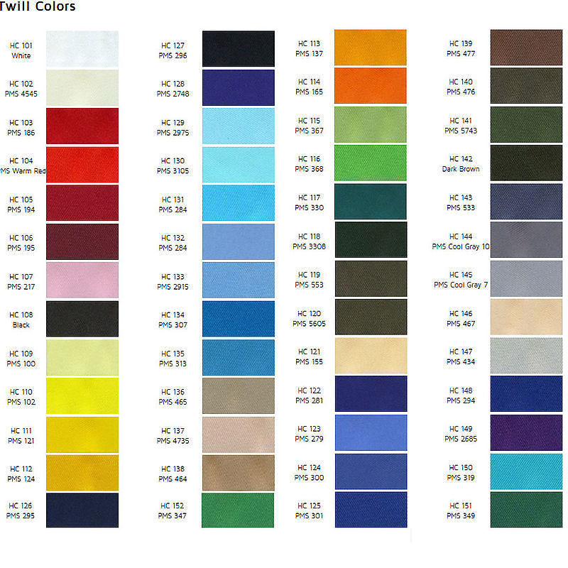 Product/Part Colors 1: 52 colors available including purple. See image of Twill Colors for full selection.