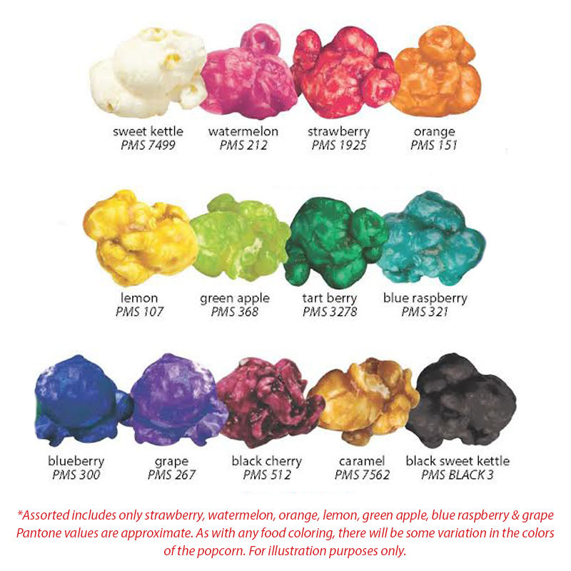 • PMS numbers are approximate. As with any food coloring, there will be some variation in the colors of the popcorn.