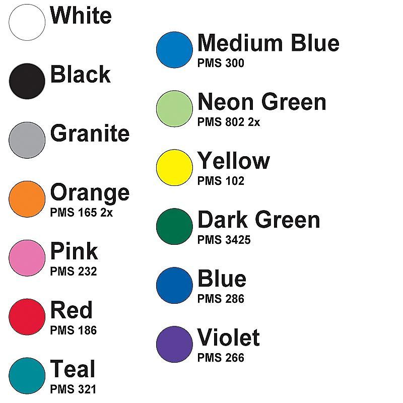 Product/Part Colors 1: White, red, neon orange, yellow, blue, violet, medium blue, dark green, neon green, teal, pink, black, green, hot pink
