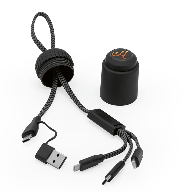 Say farewell to cable chaos with our sleek, portable cord. This pocket-sized powerhouse features the following connectors: two USB-C, one USB-A, one Micro USB, and one iOS-Compatible cable, all neatly wrapped in a stylish tube.