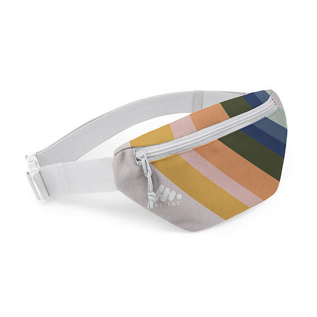 Price includes ustom full-color, full-bleed recycled canvas fanny pack. Choice of 10 trim colors for zipper, strap, and buckle.