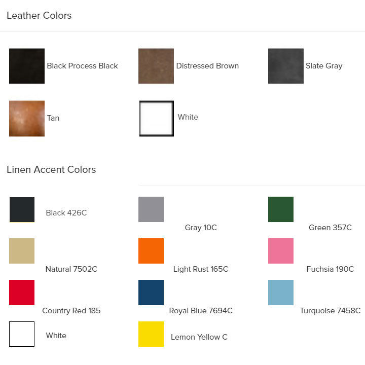 Choose from a variety of domestic, USA Made, leather colors and customize to match your company logo with several Irish waxed linen accent stitching colors to create something truly unique.