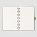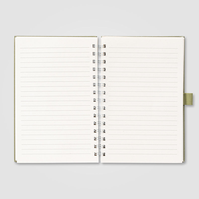 The notebook is spiral bound with a silver steel double spiral for easy page turning, and it features an elastic closure along with a matching pen loop for added convenience.