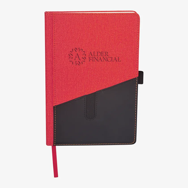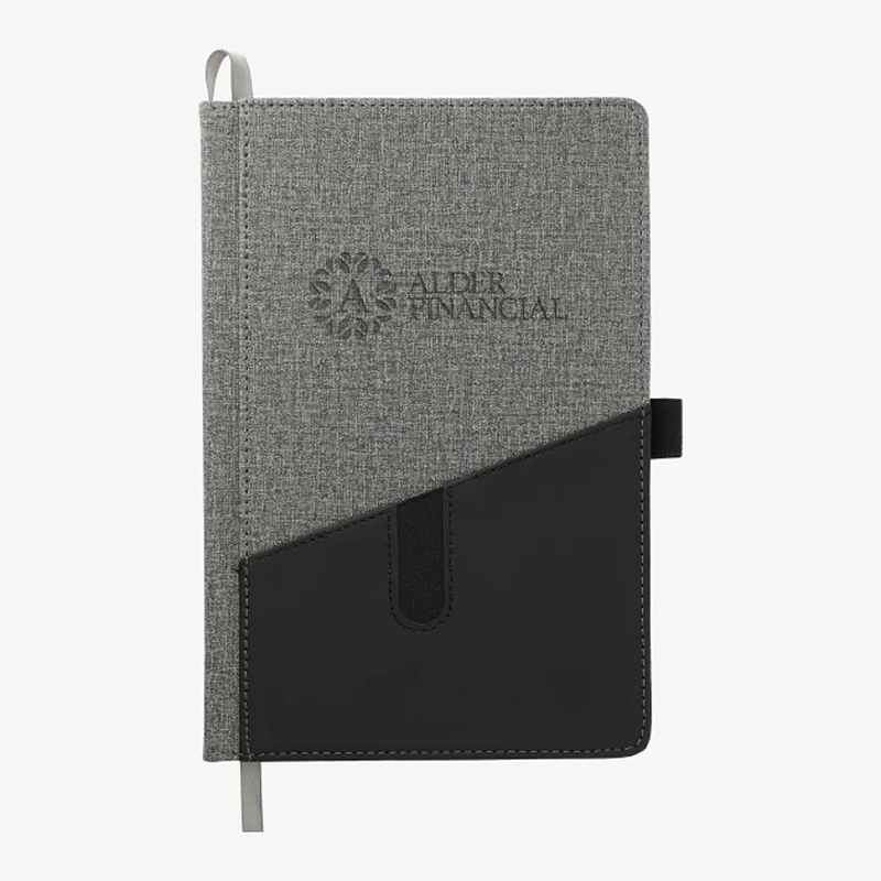 Heathered PU hard cover bound journal with front pocket for holding a smartphone, business cards or documents.