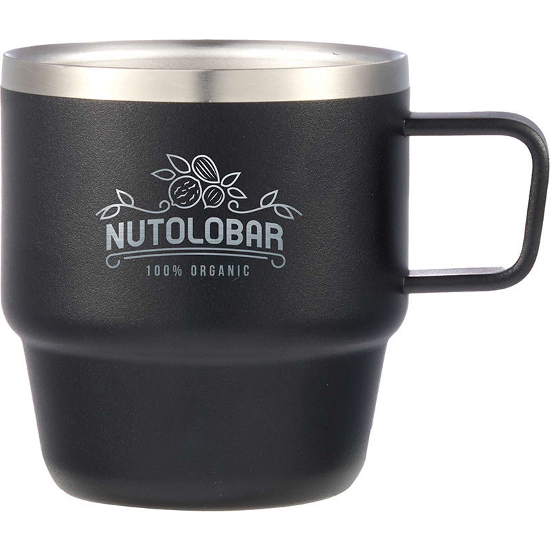 Featuring two 6-ounce recycled stainless steel mugs with a space-saving, stackable design.