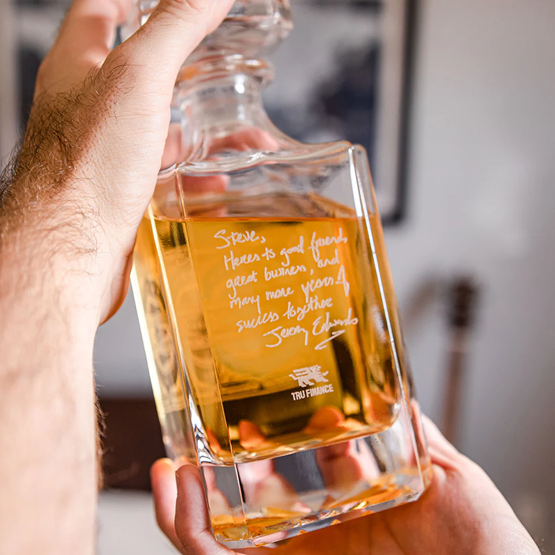 Price is per set and includes laser engraving in 1 location on each glass, decanter, and box lid