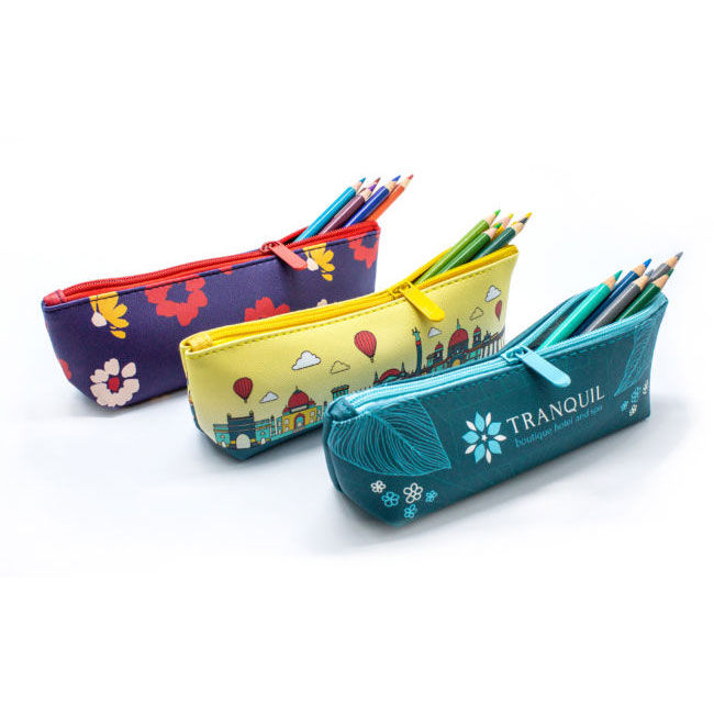 The premium vegan leather Pencil Pouch is hand crafted and printed in your client's custom full-color design.
