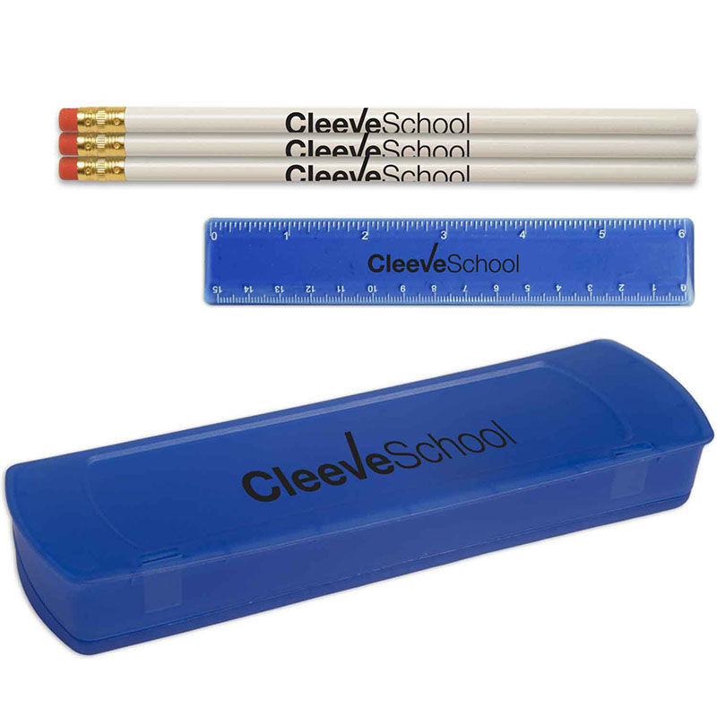 Pricing is per piece and includes a 1-color, imprint on case, pencils and ruler.