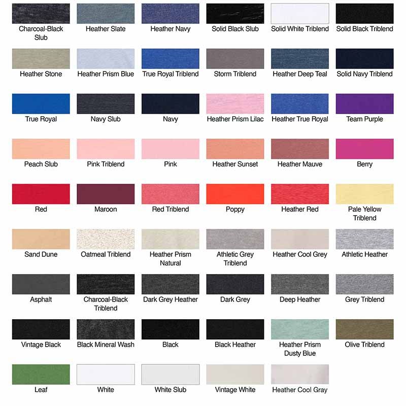 Product/Part Colors 1: Available colors: Asphalt, Berry, Black, Carolina Blue, Charity Pink, Chestnut, Citron, Dark Grey, Dark Lavender, Dusty Blue, Gold, Lavender Blue, Lavender Dust, Leaf, Maroon, Mauve, Military Green, Mustard, Natural, Navy, Orchid, Pink, Poppy, Red, Royal Purple, Sage, Sand Dune, Silver, Solid Athltc Gry, Teal, Team Purple, Terracotta, True Royal, Vintage Black, Vintage Navy, Vintage White, White