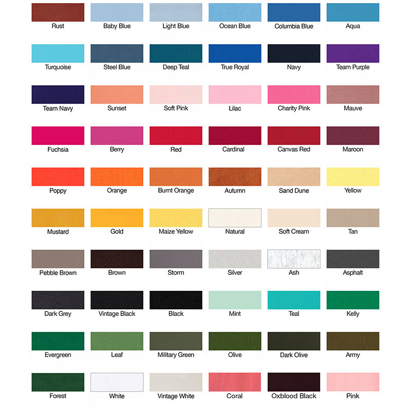 Product/Part Colors 1: Aqua, Army, Ash, Asphalt, Atlantic, Autumn, Baby Blue, Berry, Black, Brown, Burnt Orange, Canvas Red, Cardinal, Carolina Blue, Charity Pink, Chestnut, Citron, Clay, Columbia Blue, Cool Blue, Coral, Dark Grey, Dark Lavender, Dark Olive, Deep Teal, Dust, Dusty Blue, Electric Blue, Evergreen, Forest, Fuchsia, Gold, Kelly, Lavender Blue, Lavender Dust, Leaf, Light Blue, Lilac, Maize Yellow, Marine, Maroon, Mauve, Military Green, Mint, Mustard, Natural, Navy, Ocean Blue, Olive, Orange, Orchid, Oxblood Black, Peach, Pebble, Pine, Pink, Poppy, Red, Royal Purple, Rust, Sage, Sand Dune, Silver, Slate, Soft Cream, Soft Pink, Solid Athltc Gry, Spring Green, Steel Blue, Storm, Strobe, Sunset, Synthetic Green, Tan, Teal, Team Navy, Team Purple, Terracotta, Toast, True Royal, Turquoise, Vintage Black, Vintage Navy, Vintage White, White, Yellow