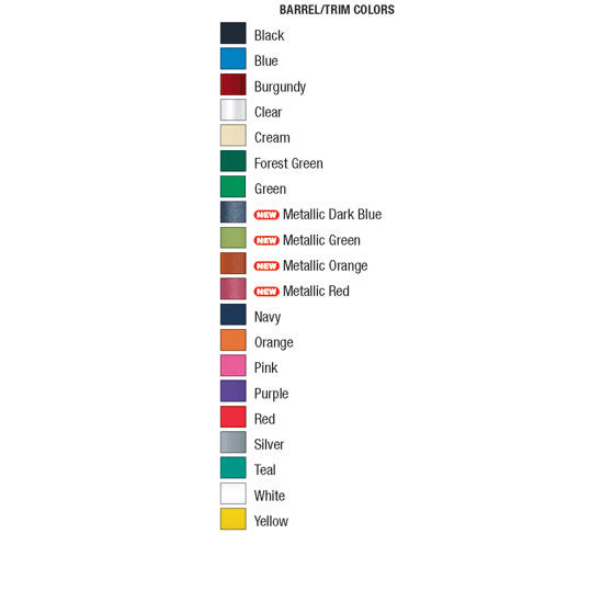 Product/Part Colors 1: Barrel/Trim: black, blue, burgundy, clear, cream, forest green, green, metallic dark blue, metallic green, metallic orange, metallic red, navy, orange, pink, purple, red, silver, teal, white, yellow