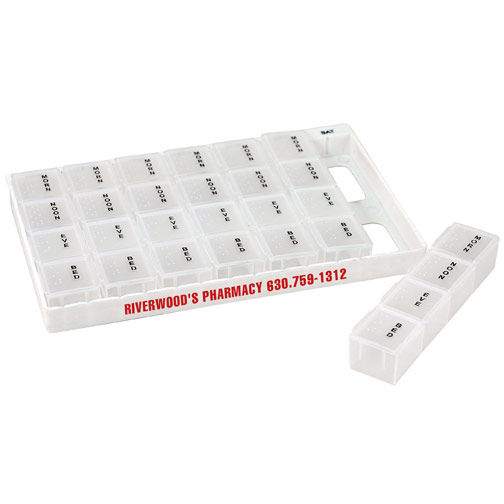 28 Slot Pillbox w/Snap-In Compartments. 4 Compartments for each day of the week!
