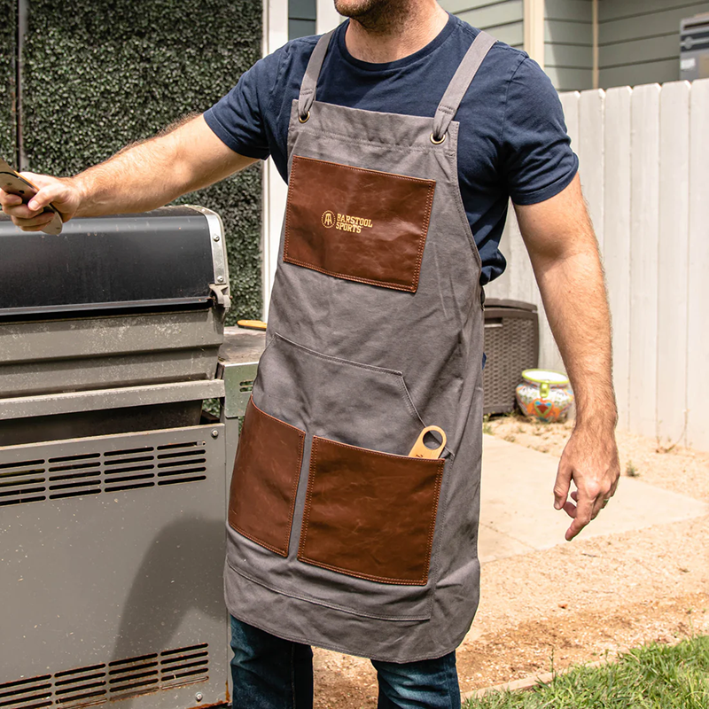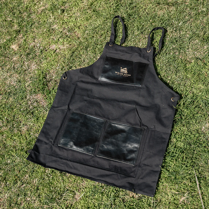 Our aprons are made with a combination of our Premium Vegan Leather, and a heavy grey waxed canvas.