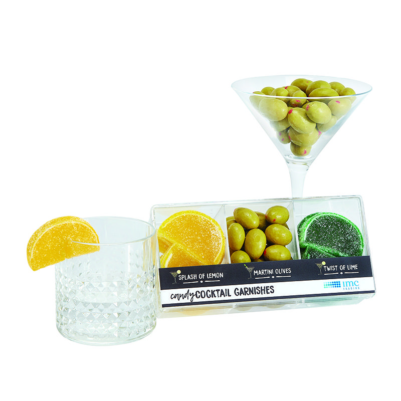 Each box includes three of our candy cocktail inspired garnishes; Sugar coated Lemon Slices, Chocolate Almond Martini Olives and Sugar coated Twist of Lime.