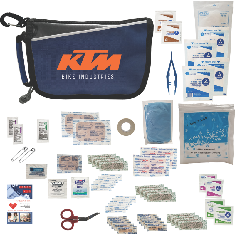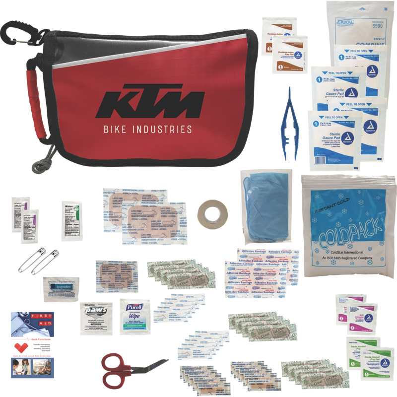 Handy front pocket, durable carabiner and a handle are some of the features of this bag...not to mention the carefully designed first aid fill.