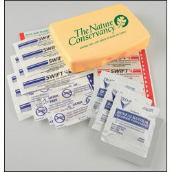 Durable living hinge box contains six adhesive bandages, five junior bandages, three antiseptic towelettes, extra large bandage and first aid card.