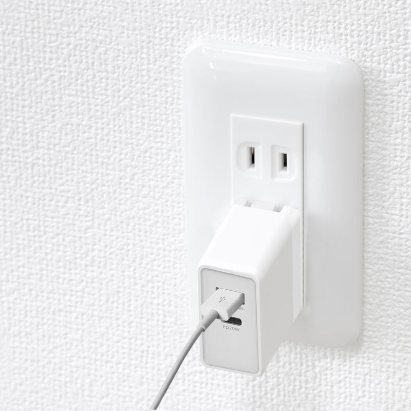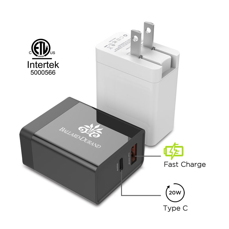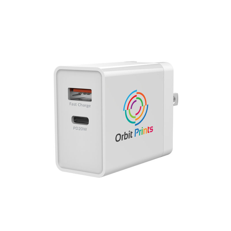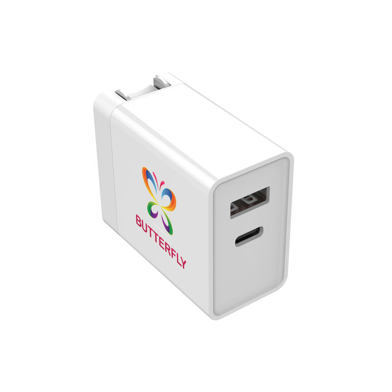 Dual USB-A and Type C wall charger adapter that is capable of charging two devices simultaneously (up to 20W).