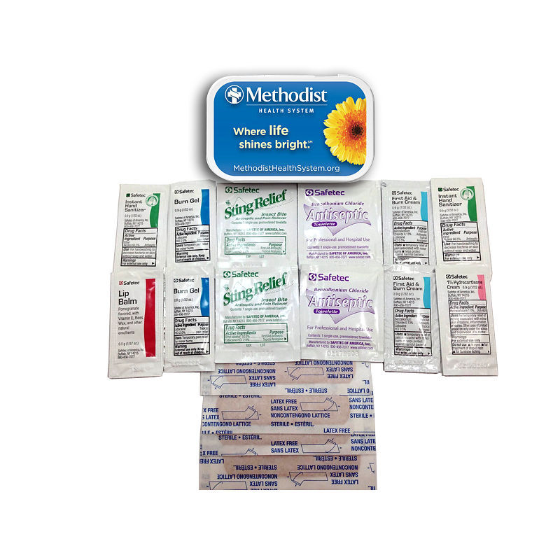 This first aid kit comes in a bag and includes everything you need to heal the hurt!