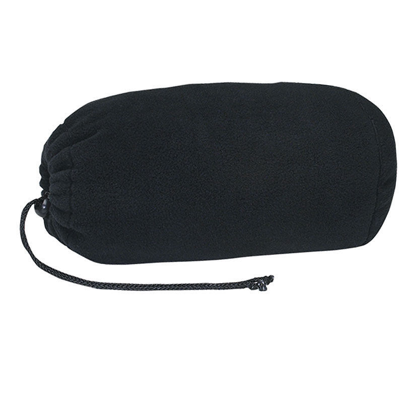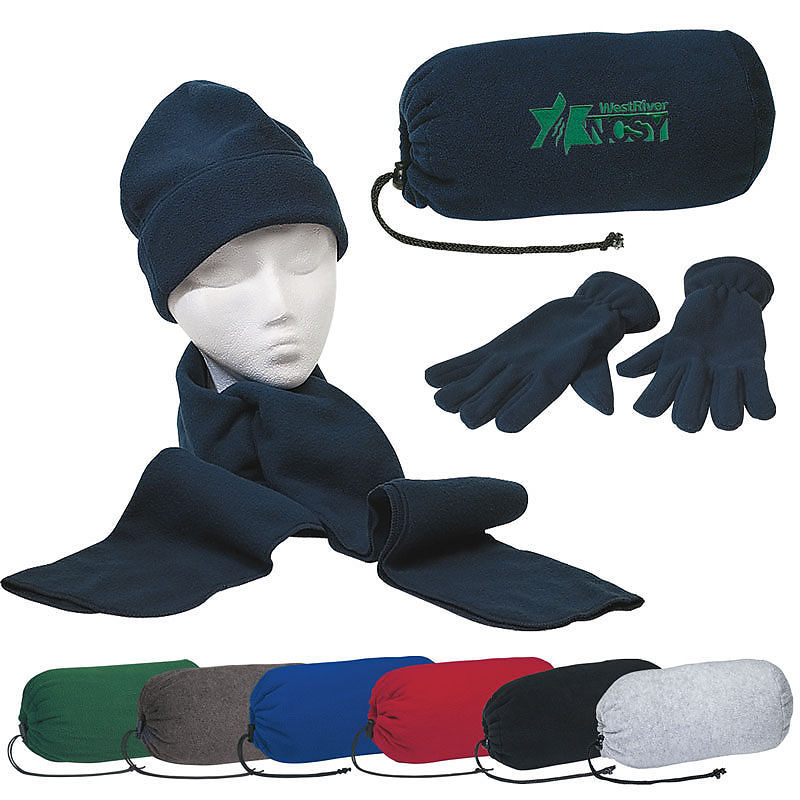 Brushed polyester fleece scarf, gloves and cap in a drawstring bag.