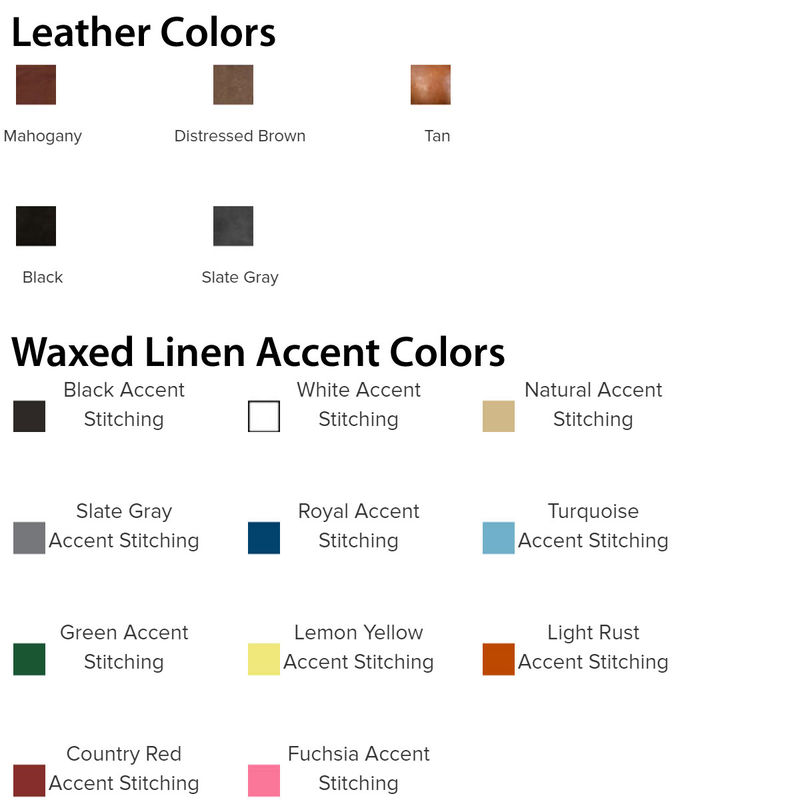 Choose from 5 domestic, USA Made, leather colors and customize to match your company logo with 11 Irish waxed linen accent stitching colors to create something truly unique.