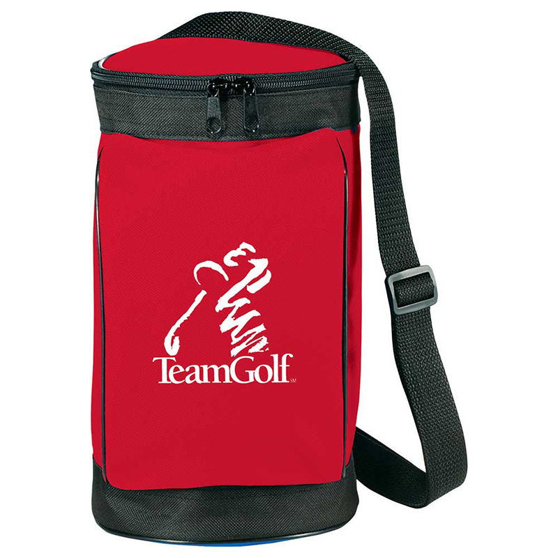 The Golf Bag 6-Can Event Cooler features a fully insulated main compartment with a liner, back and front zippered pockets and a removable and adjustable shoulder strap.