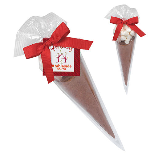 Hot Chocolate Cone Kit includes Hot Chocolate Mix (2.5 oz) and Mini Marshmallows (1 oz). Makes 3 Servings.