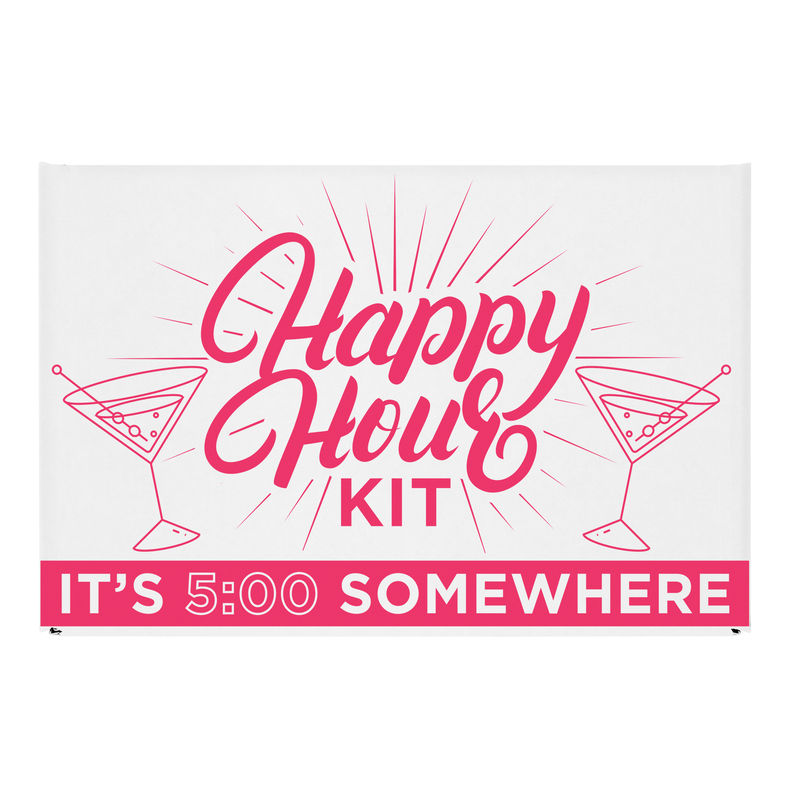 Top of mailer box exclaims "Happy Hour Kit! It's 5:00 Somewhere. Outside sticker states "Open For Snacks and Spirits!"