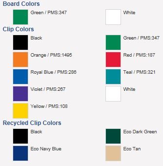 Product/Part Colors 2: Clip: black, orange, royal, violet, yellow, green, red, teal, white, Recycled Black, Recycled Navy Blue, Recycled Dark Green, Recycled Tan