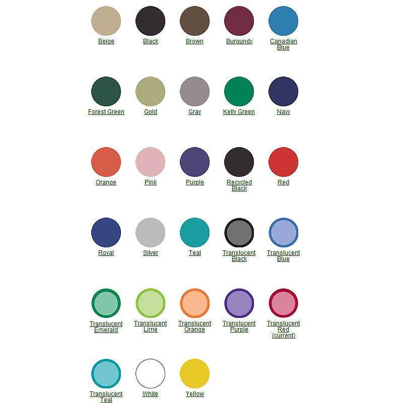 Product/Part Colors 1: Solid colors: beige, black, brown, burgundy, canadian blue, forest green, gold, grey, kelly green, navy, orange, pink, purple, recycled black, red, royal, silver, teal, white, yellow