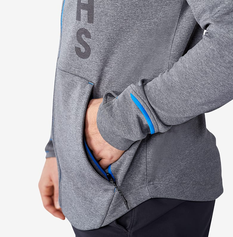 It has thumb exits for easy layering and zippered pockets to keep your valuables safe.