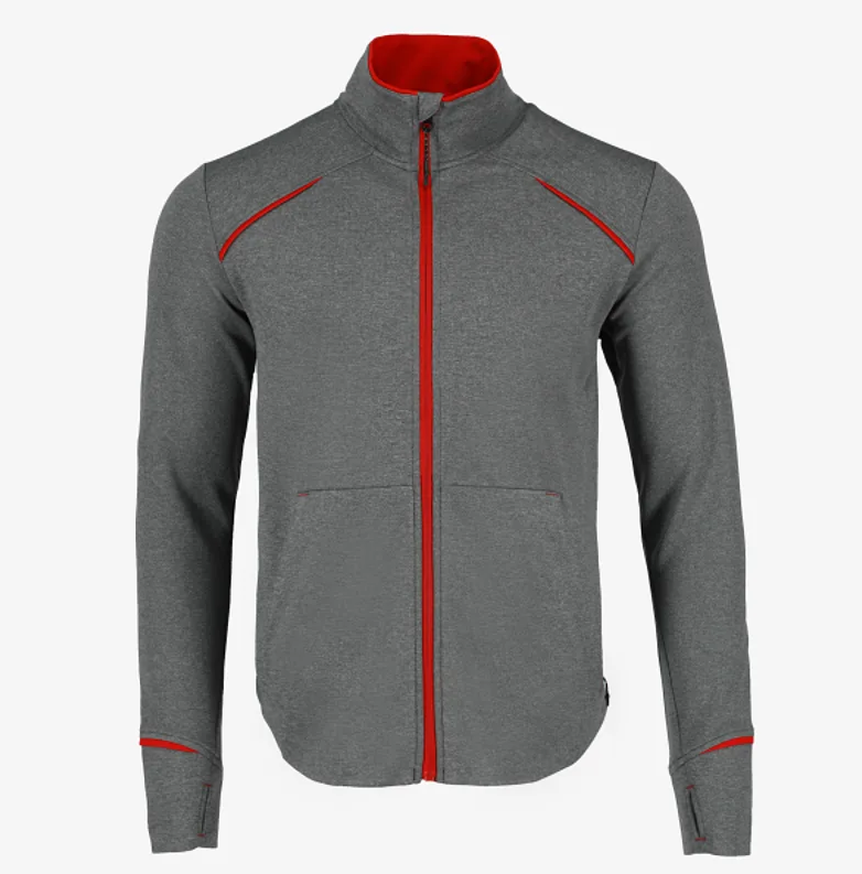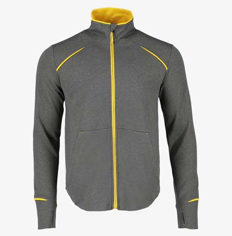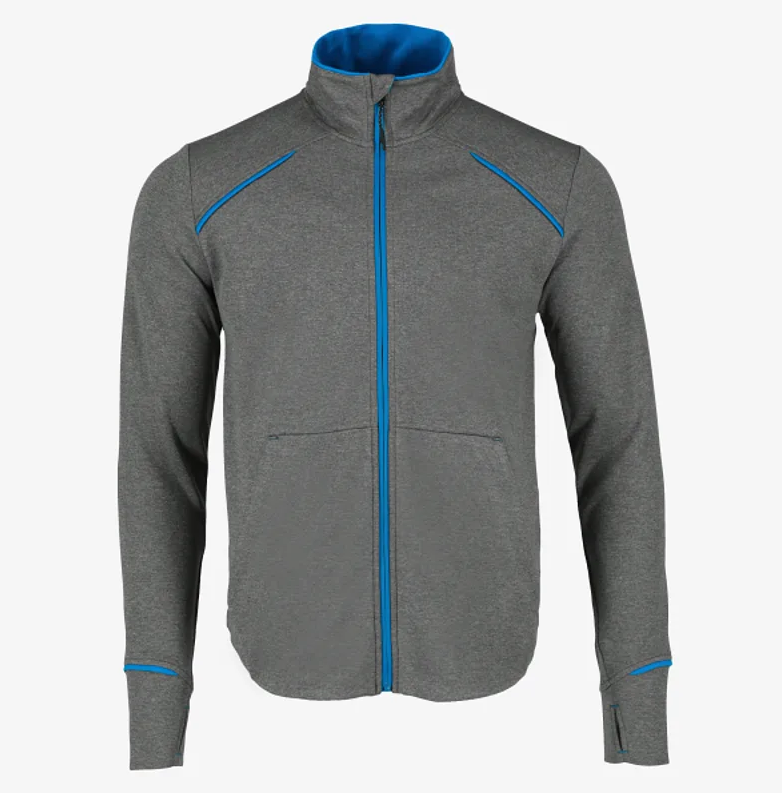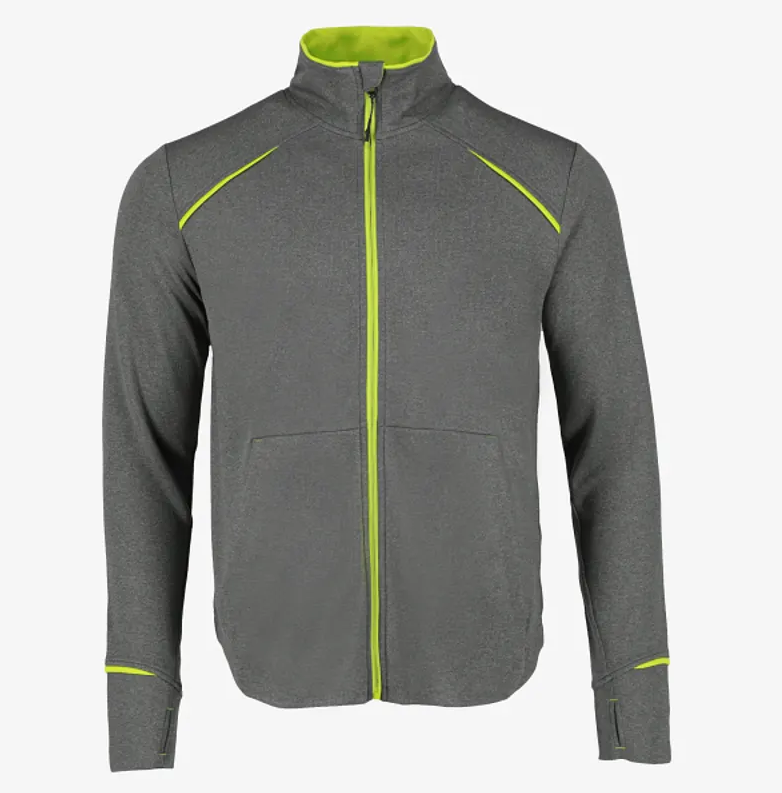 Product Material: 100% Polyester textured heather interlock doubleknit, 220 g/m² (6.5 oz/yd²). CONTRAST: 100% Polyester doubleknit birdseye mesh knit with wicking finish inner collar, zipper flap & piping.