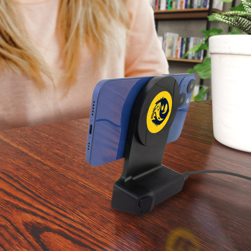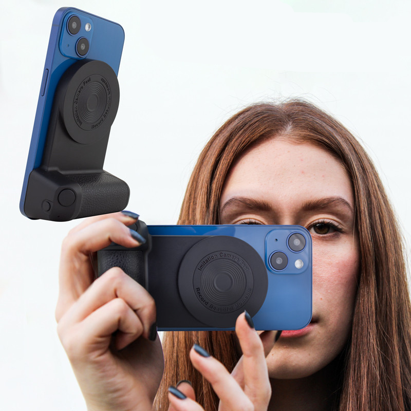 A camera grip-inspired design wireless charger and phone stand with MagSafe tech for compatible phones and a wireless-enabled shutter button for stability when video and photo capturing.